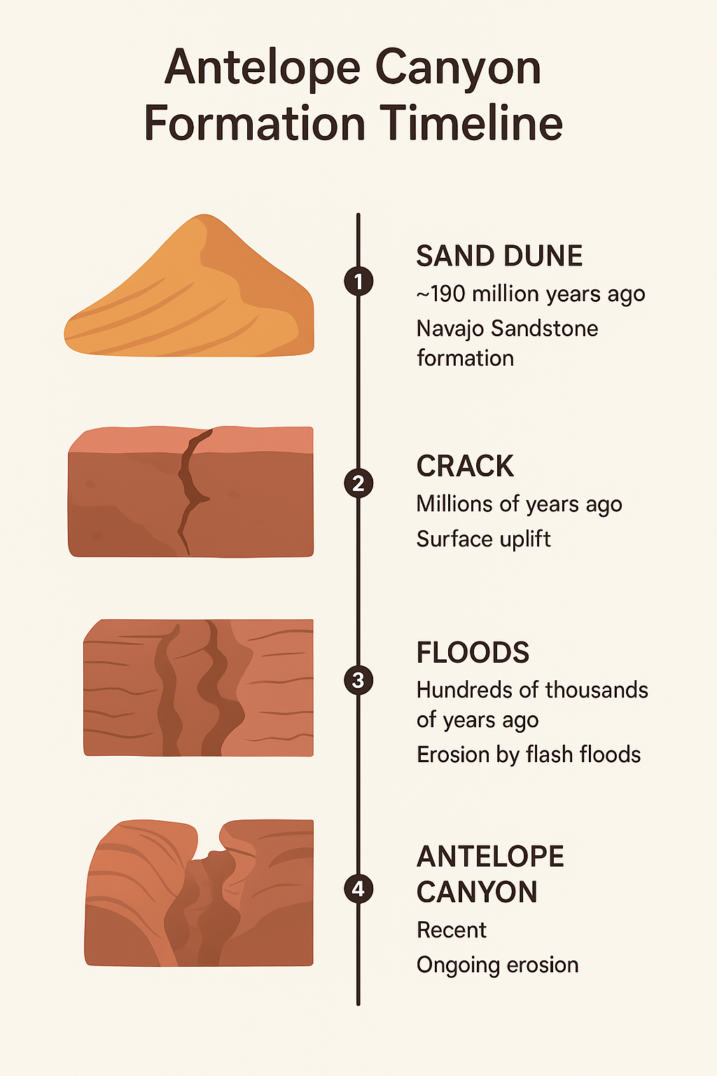 Hình thành cồn cát (khoảng 190 triệu năm trước): Câu chuyện bắt đầu từ quá trình lắng đọng của sa thạch Navajo, những cồn cát khổng lồ theo thời gian đã trở thành lớp đá nền tạo nên hẻm núi ngày nay.